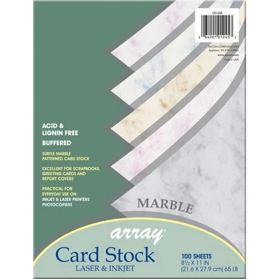 Array Card Stock is perfect for greeting cards, postcards, report covers, rubber stamping, memory books, flyers, announcements and more. This acid-free card stock comes in 100 sheet pack. Basis paper weight is 65 lbs. Assorted marble colors included are Blue, Gray, Cherry, Tan and Lilac.