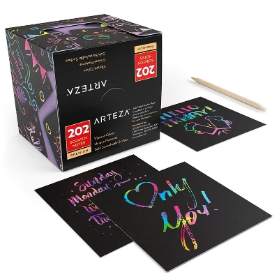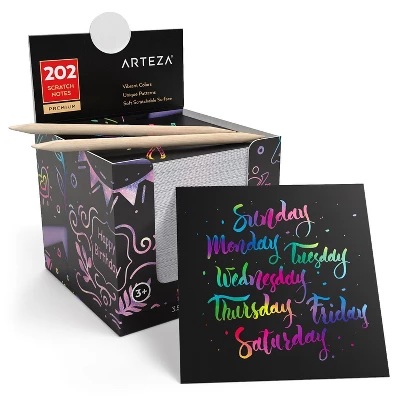 Arteza Scratch Notes, Rainbow – 202 Pack (ARTZ-8713): Variety of Vibrant Patterns – Includes 200 Rainbow and 2 Space patterned notesEasy to Use – Simply scratch the 3.5×3.5″ sheets and let your imagination do the restScratching Supplies Inside – With 2 Scratchers and 2 Sharpeners included, you’ll have everything you need to scratch with easeGreat Gift for All Ages – Watch the faces of your loved ones light up as they discover their artistic side, or enjoy these for yourself. Arteza makes art supplies affordable to creators with every budget.