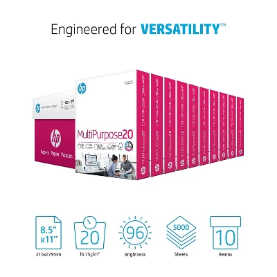 Load your office printer or copier with this HP 8.5 x 11-inch multipurpose paper. Print documents for sorting, filing and mailing with this HP multipurpose paper. The extra bright surface and white color let text stand out for easy reading, and ColorLok technology resists smearing to keep each printout crisp and neat. This HP multipurpose printer works in printers, copiers and plain paper fax machines, making it easy to keep all of your printer trays ready for action. Reliable multipurpose paper is perfect for everyday use. Paper weight: 20 lbs.; 50.8 lb. Text. Sheet dimensions: 8.5″” x 11″” (US letter). Brightness rating: 96. Smooth finish. 5000 sheets per carton. Acid Free. Color: Ultra White. FSC Certified. This 8 1/2″” x 11″” multipurpose paper is acid free and features ColorLok technology for a fast-drying, durable finished product. Suitable for most printers and perfect for almost any use, this versatile paper makes taking advantage of cost savings by buying multipurpose paper by the carton make sense. Bright White, Smooth-Finish Paper The bright white color of this paper makes it perfect for any business or personal uses. Its smooth finish means images print out sharp and clear, creating a truer representation of the original design or text. This paper also features ColorLock technology that allows each page to dry faster and gives brighter colors and strong, bold blacks no matter what the print job. Acid-Free Paper This multipurpose white paper is acid free to ensure long lasting color and durability. The paper won’t yellow or crumble as it ages, so you can preserve important documents and images for longer Stock up for the Whole Office This carton of multipurpose white paper offers 5,000 sheets wrapped in convenient reams. Perfect for use in printers, copy machines, fax machines and multi-purpose equipment, this paper’s flexible nature means one economical purchase can supply all your printing needs. The sturdy carton makes storage easy, and you know…