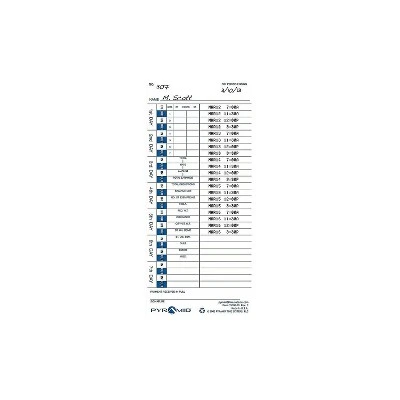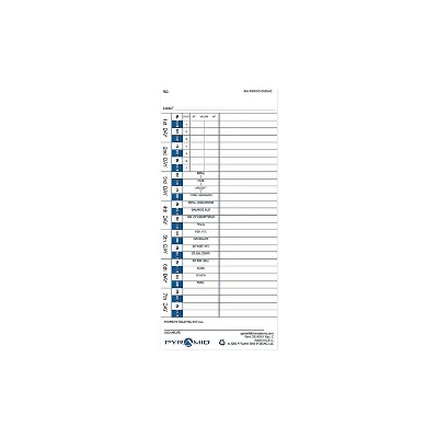 Account for the logged work hours of employees with this 100-pack of Pyramid 4 x 9-inch universal time cards for proper payroll management. Track employee attendance easily with these time cards. Each card captures up to two in/out cycles per day for seven days, and specific data fields provide a detailed breakdown of various forms of compensation and pay deduction. This 100-pack of Pyramid universal time cards works with most side-loading time clocks. Universal time card works with all manufacturer side-loading time clocks and accommodates two cycles of employee in/out punches for seven days of week. For use with Pyramid 3000HD, 3500, 3550SS, 3600SS, 3700, or any side-loading time clock. Dimensions: 4″W x 9″L. White heavy-duty cardstock. 100 time cards per pack. Data fields include Employee Number, Name, Pay Period Ending, Signature, Reg Hours, OT, Total Hours, Rate, Amount, Earnings, Deductions, Balance, Exemptions, Med SS (FICA), Federal Tax, Insurance, City/State Tax, Unemployment, Disability, Garnishments, and Misc. Contains 30% post-consumer recycled content. Universal FormatPyramid 3000 Series time cards are compatible with any side loading time clock. Records employee time punches for seven days of week with rows for two IN/OUT punches per day. Data FieldsTime card data fields include Employee Number, Name, Pay Period Ending, Signature, Reg Hours, OT, Total Hours, Rate, Amount, Earnings, Deductions, Balance, Exemptions, Med SS (FICA), Federal Tax, Insurance, City/State Tax, Unemployment, Disability, Garnishments and Misc. Clear, Concise Employee Time Records35100-10 time cards are printed on 110# sturdy cardstock containing 30% post-consumer recycled content to promote clear, crisp time entries. What’s in the Box100 Time Cards. Sold as 100/Pack.